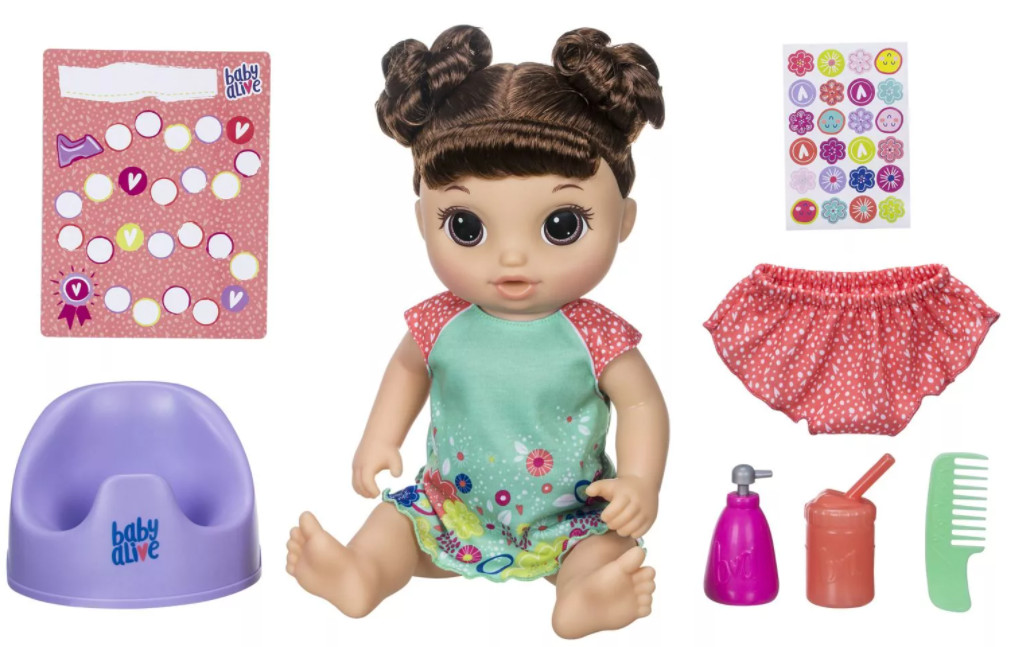 Одни из самых модных кукол для девочек, мечта многих детей по всему миру. Игрушечный реалистичный пупс, способный пить, есть, плакать, ходить на горшок и засыпать с соской во рту. Вместе с игрушкой в комплект входит соска-пустышка, пакетик с кашей, бутылочка, тарелка и ложка, памперс, медальон, браслет и горшок. Розовый комбинезон и шапочка, в которую одета кукла, легко снимаются и надеваются.