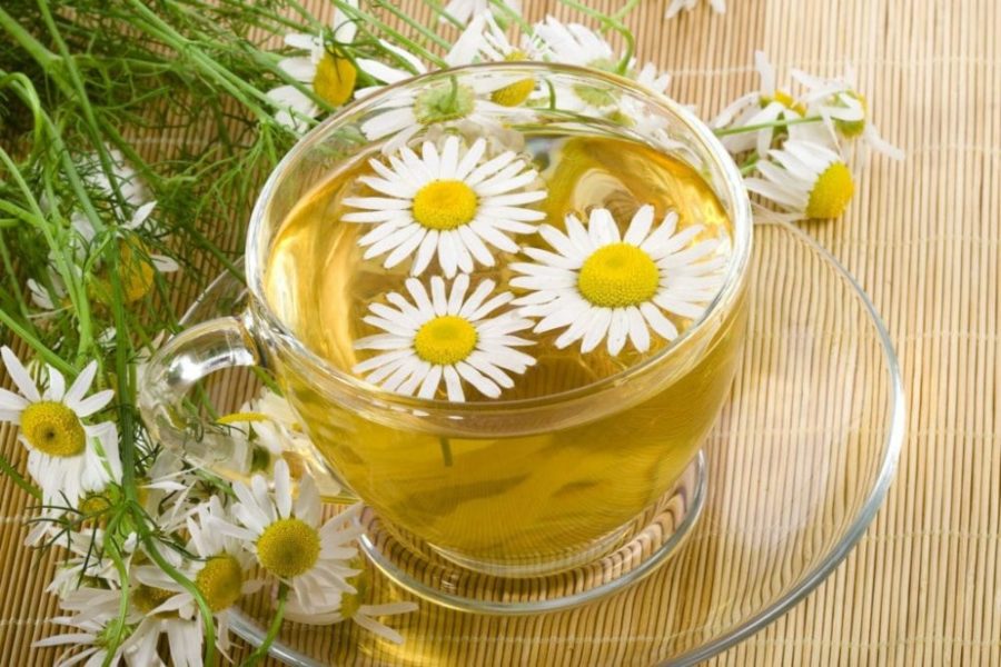 - Залить 15 г аптечной ромашки 2 стаканами кипятка.