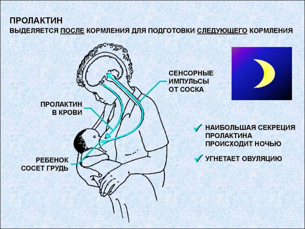 Роды приводят к тому, что в женском организме начинает вырабатываться гормон пролактин в усиленном режиме, что способствует появлению молока. Сосание ребенка груди способствует стимуляции нервных окончаний соска, а это в свою очередь, усиливает выработку пролактина. Наибольшее количество такого гормона, вырабатываемого в организме женщины, происходит в ночное время. Поэтому кормление ребенка грудью в ночные часы обязательно, даже если он спит. Это позволит сохранить лактацию на довольно продолжительный период времени. Высокое содержание гормона пролактина подавляет овуляцию, что в свою очередь, влияет на отсутствие менструации.