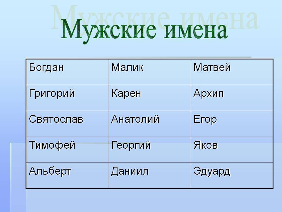 Первые 4 относятся к редким, классическим для России мужским именам, остальные – к необычным, зарубежным или старославянским.