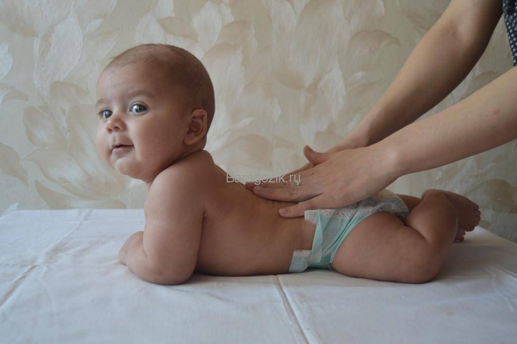 Малыша переворачивают на живот, массируют спину. При массаже спины физически воздействовать на позвоночник нельзя. Совершают мягкие движения «вверх-вниз» от ягодиц до шеи и обратно вдоль позвоночного столба.
