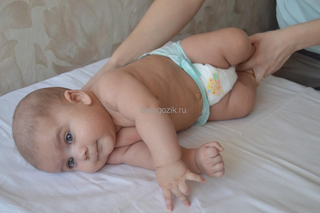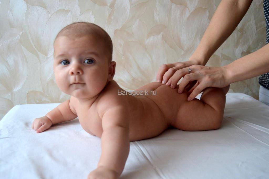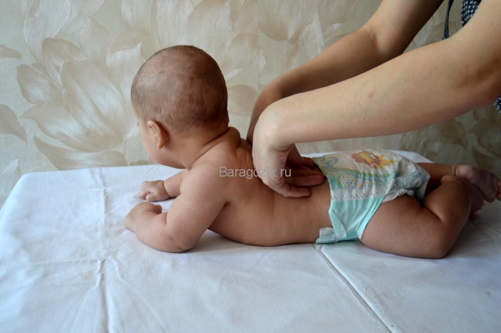 Затем можно снять памперс, и касаниями пальцев выполнить нежный массаж области ягодиц, поясницы и бёдер малыша.