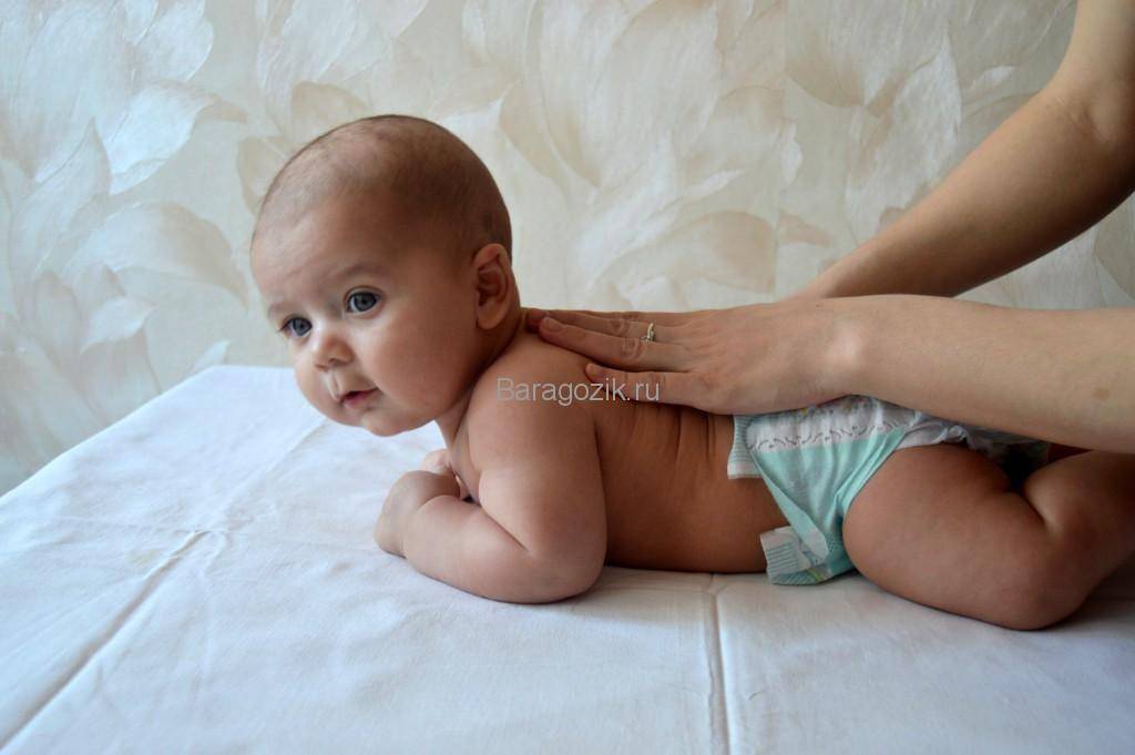 Исходное положение — на боку. Одной рукой придерживаете малыша за ножки, пальцами другой руки погладьте по спинке снизу вверх и обратно, не забывая погладить лопатки и плечики.