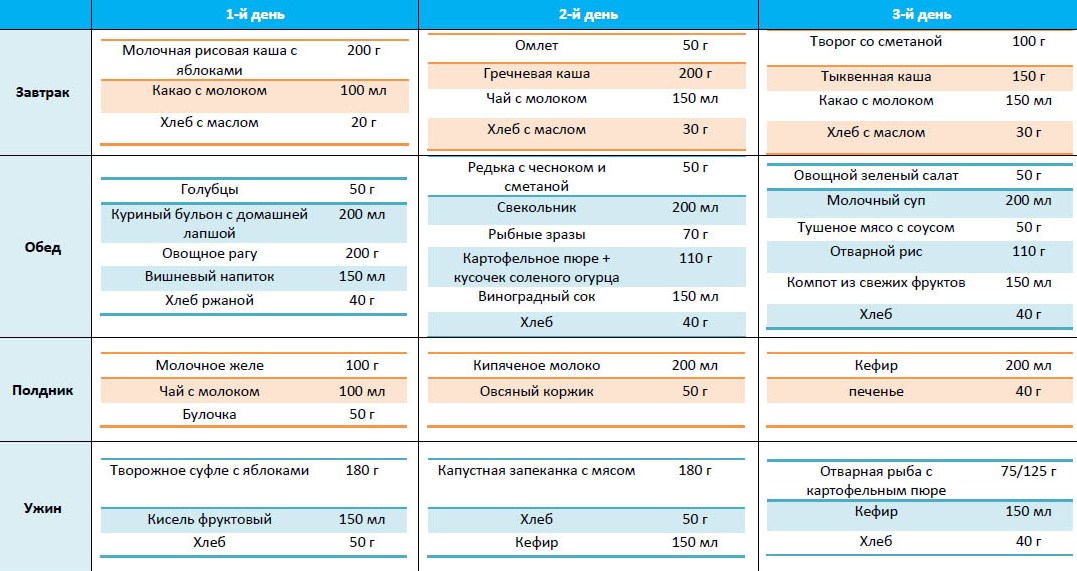 В рационе обязательно нужны мясо, кисломолочные продукты, фрукты, овощи, хлеб, масло. Рыба и яйца даются до трех раз в неделю.
