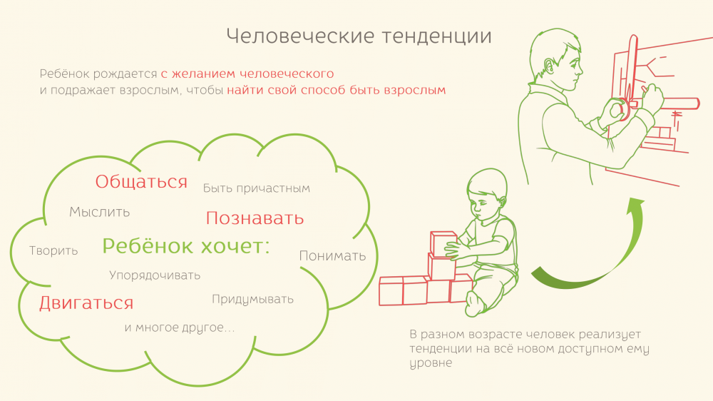 Взрослый в состоянии самостоятельно позаботиться о воплощении тенденций и способен ради этого изменять мир вокруг. А ребёнок нуждается в грамотном сопровождении, подготовленной среде, хотя и он реализует их исключительно в собственной активности.