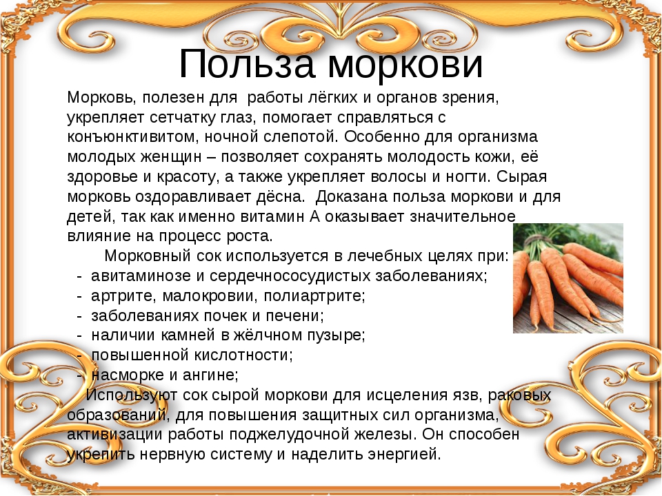 Ученые утверждают, что в организме человека, съедающего в день порядка 150 г моркови, снижается «плохой» холестерин – результат минус 20%. - Заряжает энергией.