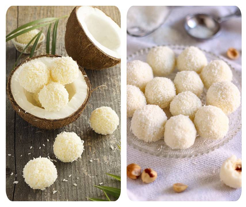 - Заготовку опустить в емкость со стружкой кокоса, обвалять, сформировать конфету круглой формы.