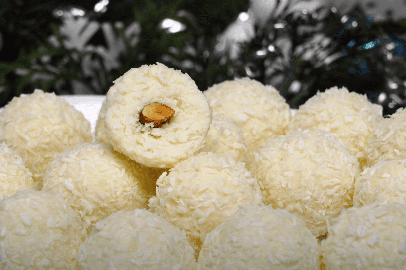 Этот десерт Рафаэлло отличается мягкой и воздушной консистенцией, буквально тает во рту. Единственный минус – не очень удобно формировать конфеты.