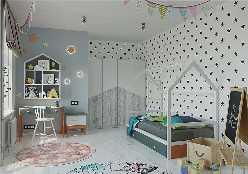 Встроенная мебель – это прекрасный визуальный прием, который поможет увеличить пространство в комнате. Шкафы можно сделать абсолютно скрытыми, можно обозначить дверцы рисунками, наклейками или разместить в специальных нишах в стене.