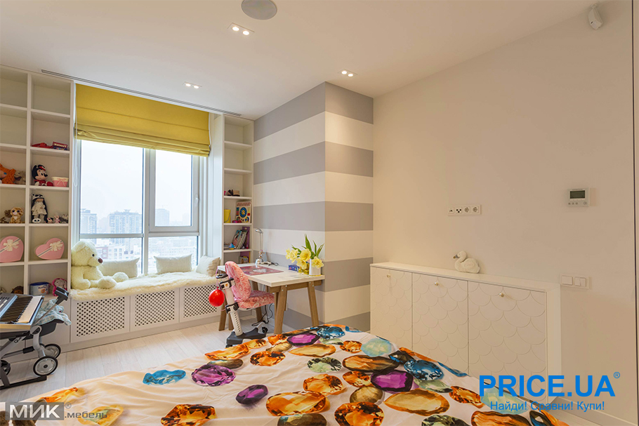 Если в комнате есть мальчик — девочка тоже будет хулиганистой. Дети будут носиться, будут падать, будут неочевидным образом взаимодействовать с мебелью. Неплохо бы подумать о безопасности — эту тему разбирали в статье про дизайн детской комнаты.