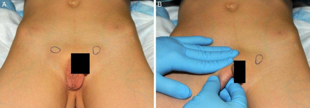 Неонатологи внимательно осматривают новорожденных и замечают проблему первыми. При возникновении каких-либо отклонений от нормы, рекомендовано наблюдение до 3 месячного возраста, проведение анализов на гормоны, УЗИ брюшной полости.