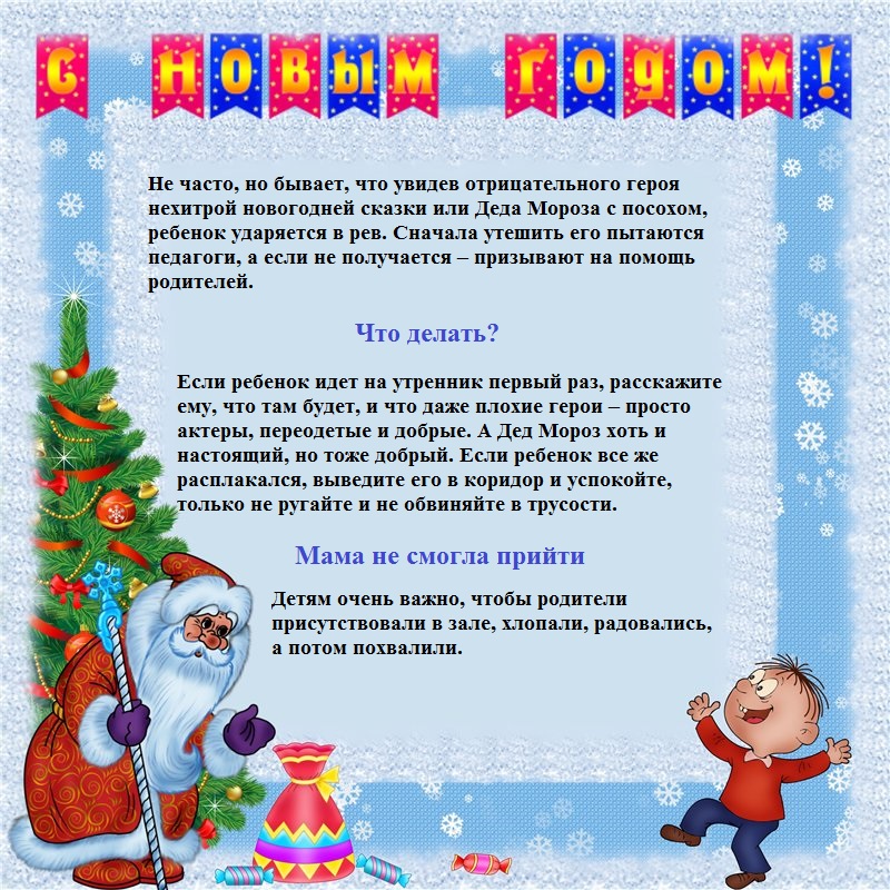 Поэтому от визитов Деда Мороза и Снегурочки (или переодевания в них) стоит всё же воздержаться: реакция ребёнка в этом случае может быть непредсказуема. С общением со сказочными героями следует повременить лет эдак до 4–5.