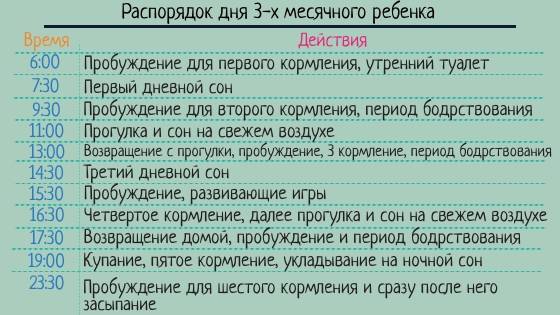Режим дня зависит от количества кормлений и биоритмов ребенка (кто-то встает утром раньше, кто-то позже, кто-то больше спит днем) и, зачастую, отличается у всех детей одинакового возраста. Подстраивайтесь под ребенка, но старайтесь кормить и укладывать спать ребенка каждый день в одно и то же время, так у него будет меньше проблем с пищеварением и со сном. Примерный распорядок дня малыша в возрасте от 2 до 3-х месяцев: