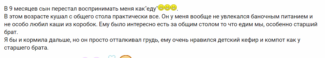 Часто приходится слышать советы в духе: намазать сосок зеленкой (горчицей) и сказать, что молоко испортилось или что грудь у мамы заболела. Сложно представить себе весь спектр эмоций ребенка в этот момент. Это могут быть: страх, ощущение предательства, обида и грусть, злость и гнев, чувство вины. Бывают случаи истинной самоотверженности.