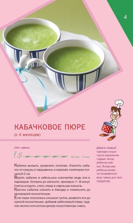 | Кабачок | Витамины А, С, клетчатка, калий, медь, низкая калорийность. | Укрепляющее воздействие на сердечно-сосудистую систему, улучшение пищеварения. | Гипоаллергенный | С 4 мес. |