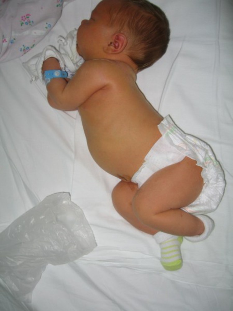 - если уложить малыша на животик, он не старается согнуть руки и поднять голову, а опускает лицо на поверхность;