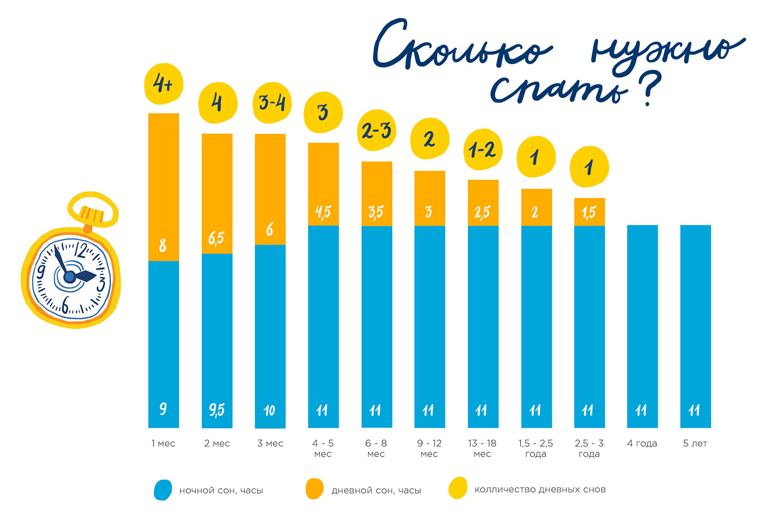 Пятимесячные дети пробуждаются реже, а к годовалому возрасту родителям потребуется вставать к малышу раз или два раза в темное время суток. 3-х месячные груднички спят около 16 часов, а с шести месяцев им хватает 13-14 часов на сон в сутки.