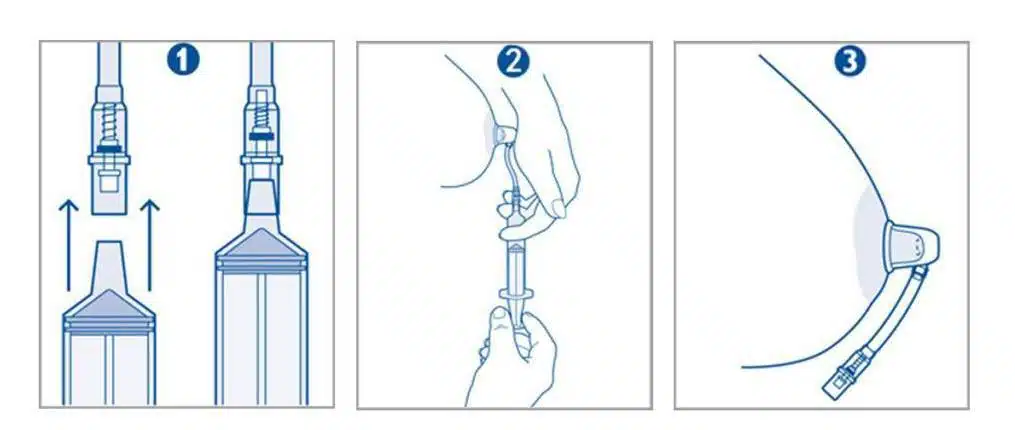 Следующий вариант формирователей сосков выглядит чуть не привычнее. Он состоит из двух частей. Первая часть — это обычный шприц. Вторая часть состоит из наконечника с гибкой трубочкой. Сосок вставляется в наконечник, а гибкая часть трубочки необходимо плотно присоединить к шприцу. Благодаря гибкости трубочки шприц можно держать в любом положении.