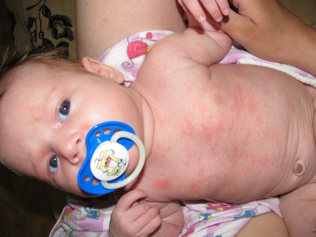 Проявляется в виде прыщичков красного цвета, внутри которых может быть прозрачна жидкость. Если жидкость стала желтой или мутной, значит, началось инфицирование, требуется прием у педиатра. На начальных этапах развития раздражения сыпь появляется только в складочках шеи, а затем, если ее не лечить, переходит на лицо.