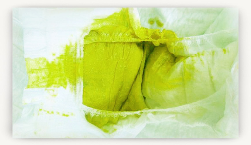 - Испражнения чаще всего зеленого цвета, может присутствовать кровь;