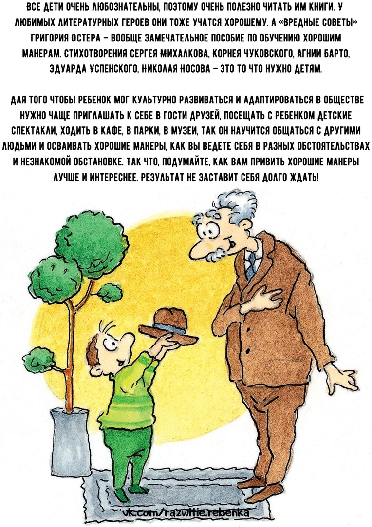 Очень важно транслировать хороший вкус через собственный пример: быть опрятным и вежливым, бережно относиться к вещам, носить разную и качественную одежду, слушать хорошую музыку и т.д. Заниматься саморазвитием нужно в любом возрасте, особенно учитывая, как стремительно меняется общество и его стандарты