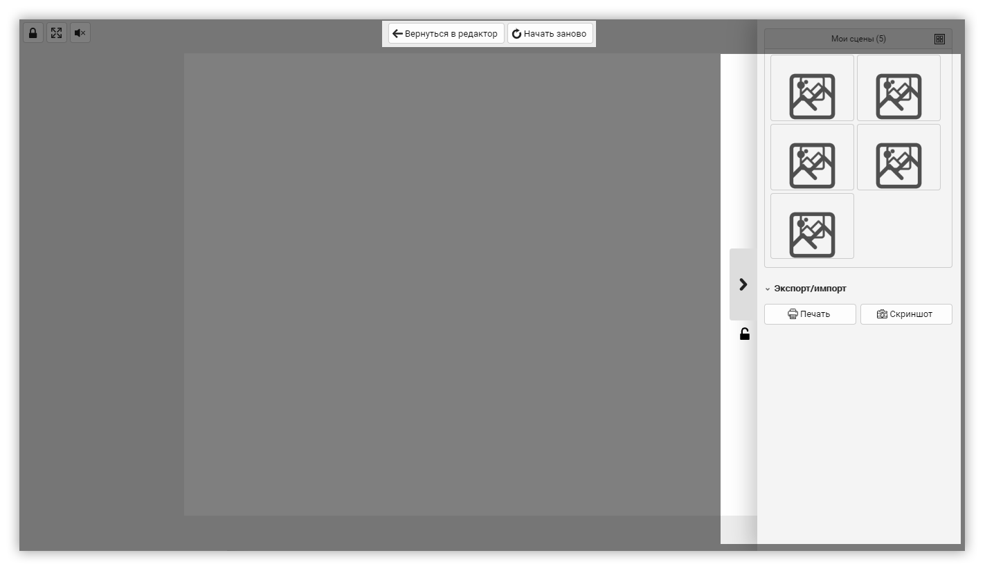 Кнопка «Начать заново» сбрасывает изменения, которые произошли во время занятия. Сцена восстанавливается до исходного состояния как перед включением режима.