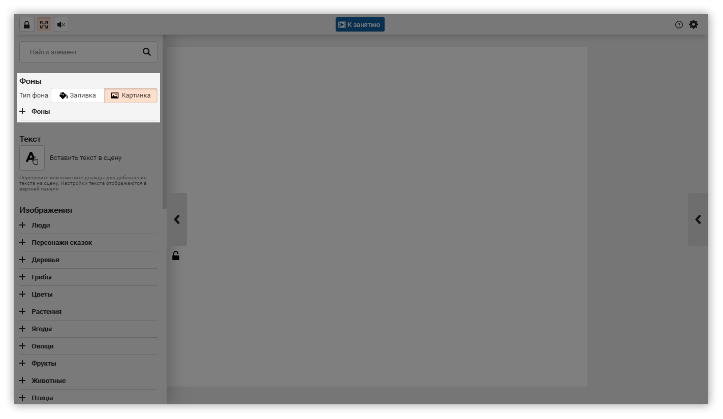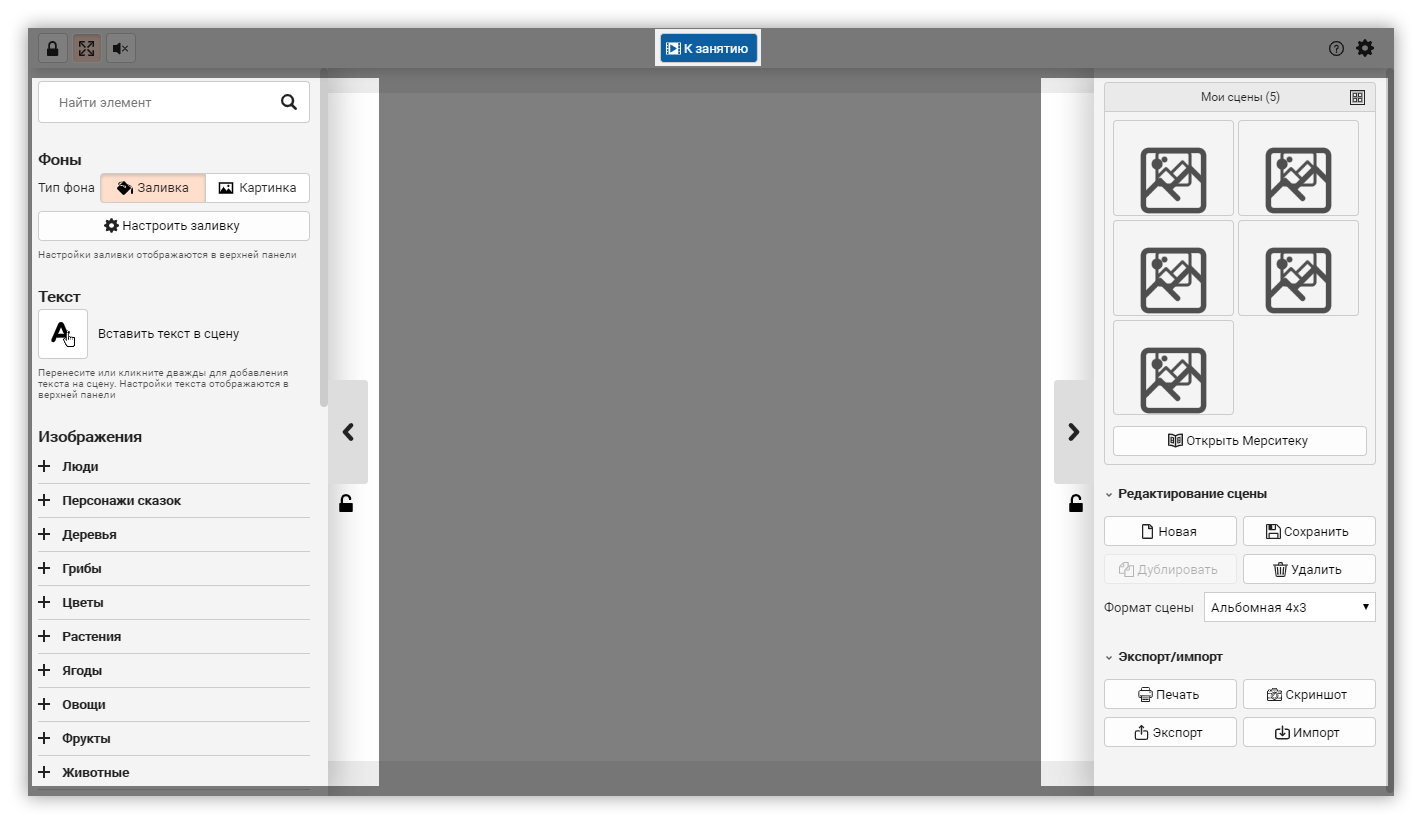 В этом режиме вы занимаетесь с ребенком, в нем доступна только сама сцена и правое меню с ограниченным функционалом.