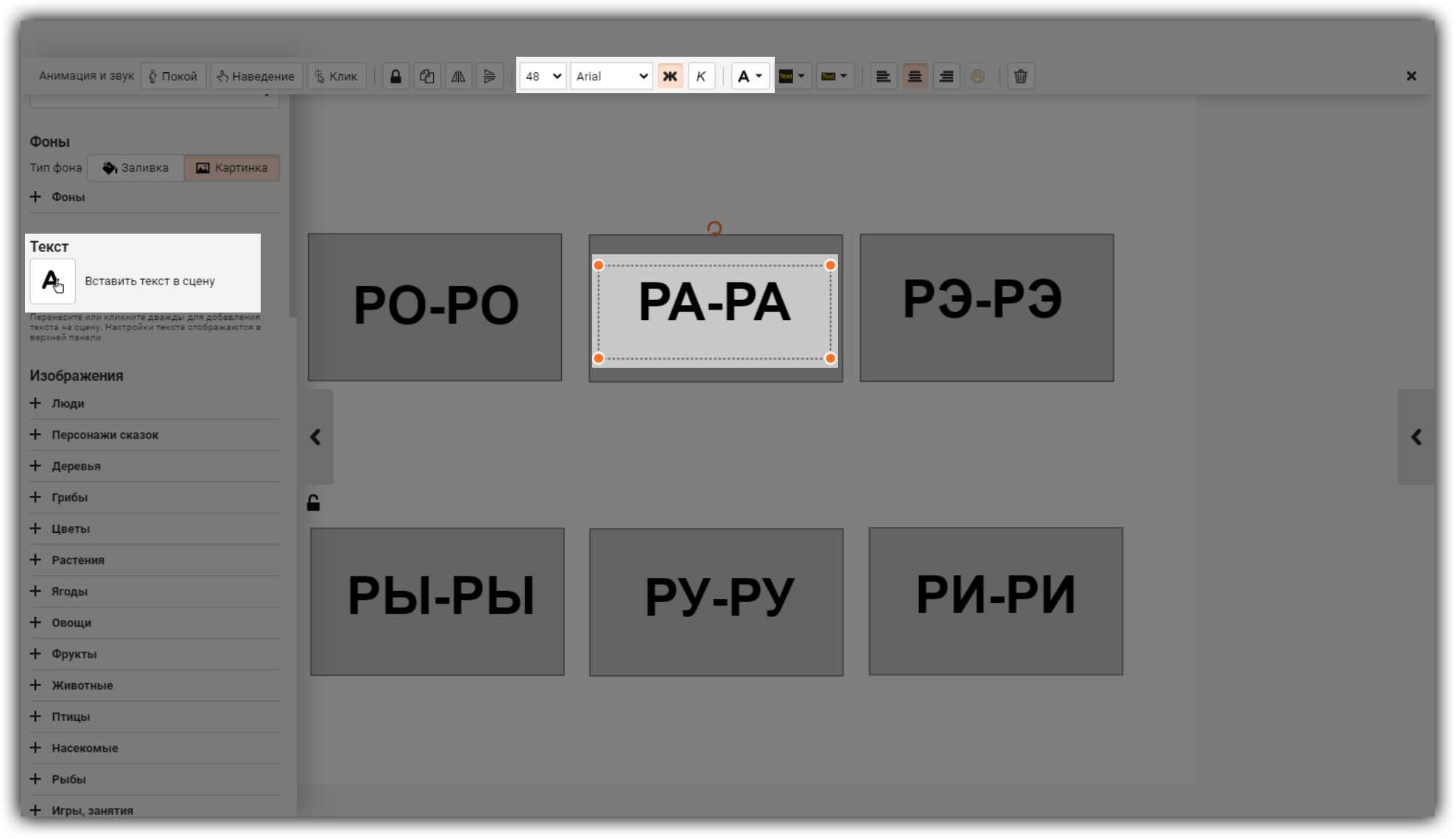 В этом режиме вы делаете пособие: добавляете картинки и текст, настраиваете анимацию и звук. Вам доступны все инструменты и разделы меню.