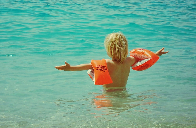 - Познакомьте ребенка с надувными средствами для плавания. Пусть он убедится, что круг, нарукавники или даже жилет надежно удерживают его на воде. Выбирайте их по размеру, чтобы малыш не выскальзывал и был надежно защищен.