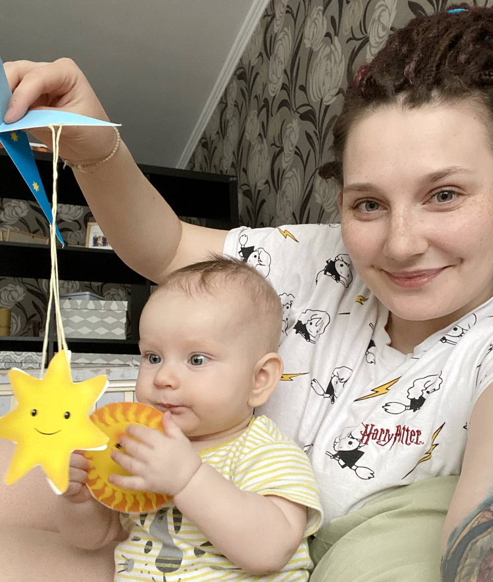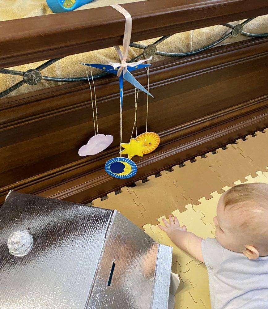 Это вдохновило меня на то, чтобы самой сделать для сына игрушки. Коробку — из упаковки от торта, которая была дома. А ещё я своими руками сделала мобиль. Малыш был в восторге — смеялся и пытался грызть.