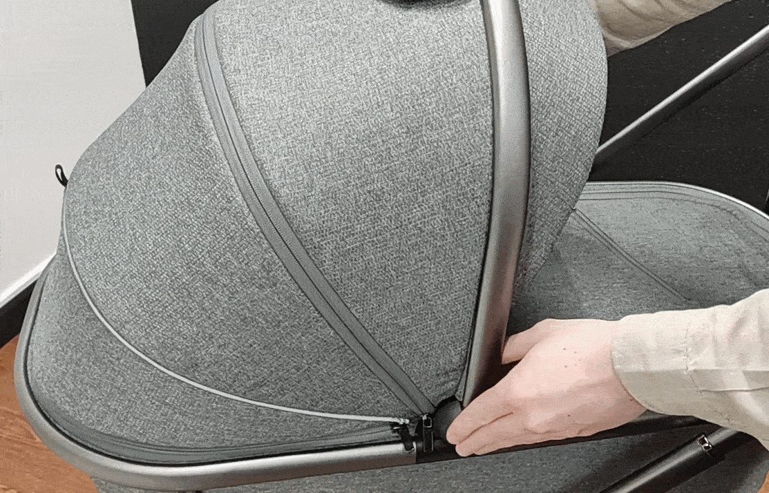 Капор с фиксаторами «трещотка». Чтобы сложить и разложить его, нужно приложить усилие. Фиксаторы громко щёлкают, вибрация передается на раму