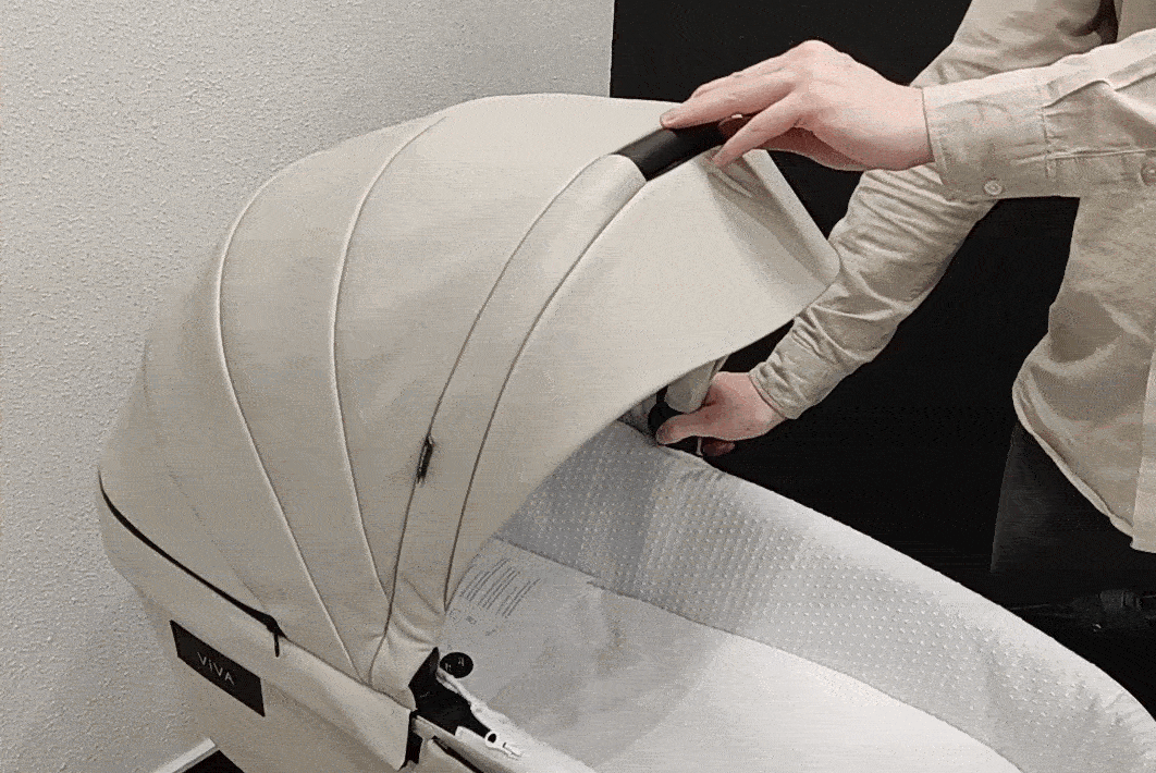Фиксация на двух кнопках с функцией памяти — на кнопки нажимают поочерёдно, потом можно откинуть капор. Так откинуть капюшон можно одной рукой, а второй, например, держать ребёнка
