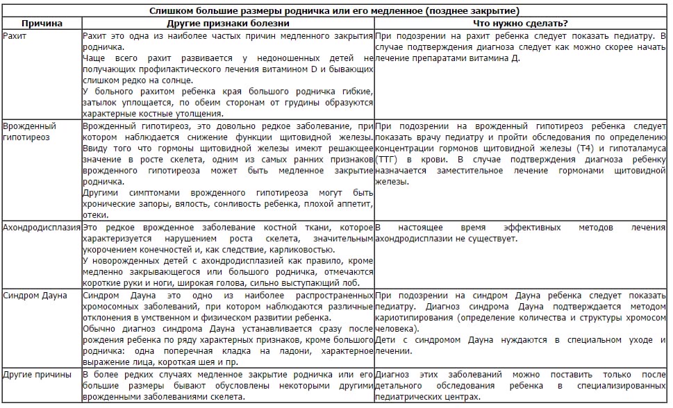 Приведённые выше заболевания отражаются на размерах и скорости роста родничков: большой размер и позднее закрытие. Родителям необходимо показать своего малыша специалистам.