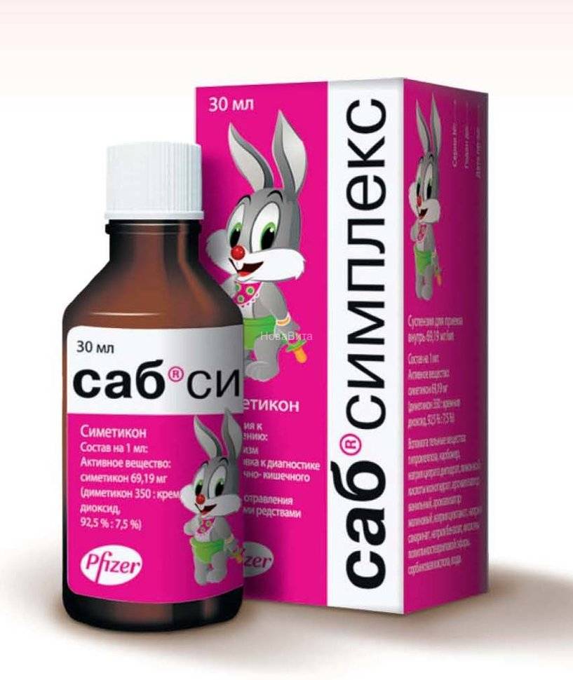 Многие мамы знают французский препарат «Саб Симплекс», который выпускается в виде суспензии для приема внутрь. Действующим веществом препарата является симетикон. В 100 мл «Саб Симплекс» содержится около 6.9 г вещества симетикон, а также другие вспомогательные ингредиенты: лимонная и сорбиновая кислоты, гипромеллоза, карбомер, натрия сахаринат, натрия бензоат, ароматизаторы малиновый и ванильный и др.