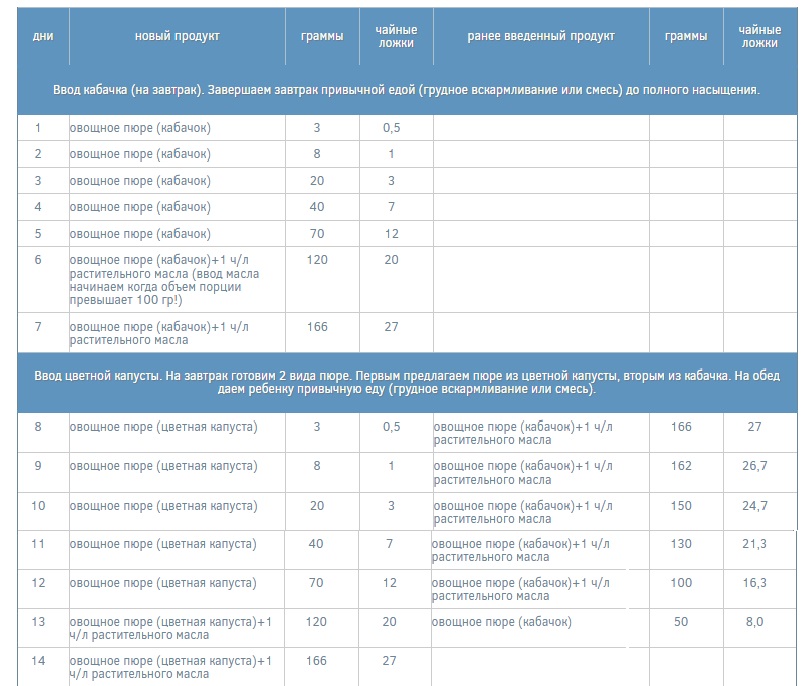 | Седьмой | 150 г кабачкового пюре, далее докармливать грудным молоком или смесью |