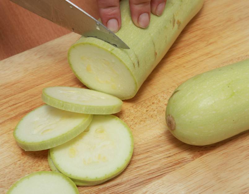 Для приготовления кабачок необходимо нарезать кусочками толщиной не более 2 см. Можно выполнить нарезку кубиками, полукругами, кружками — как удобно.