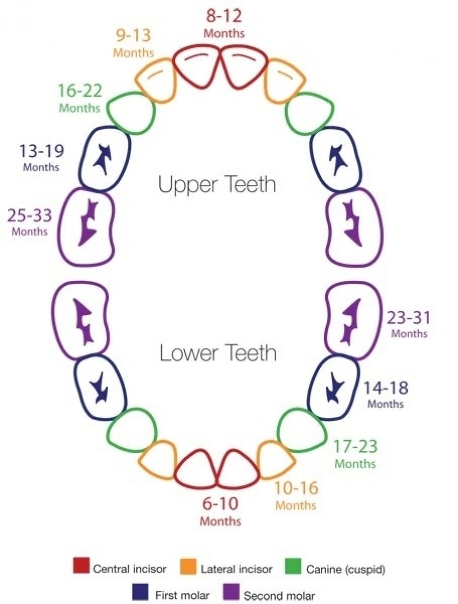 После прорезывания нижних центральных резцов в возрасте 6 или 7 месяцев (в среднем), в последующие месяцы прорезываются верхние центральные резцы. Боковые резцы (передние зубы, расположенные непосредственно по бокам от центральных резцов) следуют как сверху, так и снизу, а затем клыки.