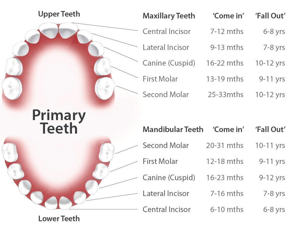 Прорезывание молочных зубов, как и большинство вех развития, происходит в соответствии с собственным уникальным графиком. У некоторых младенцев зубы начинают прорезываться только в возрасте трех месяцев, а у некоторых во рту нет ни одного зуба на первом дне рождения. В среднем у большинства младенцев зубы начинают прорезываться в возрасте около 6 месяцев, а остальные зубы медленно прорезываются в течение следующих двух-двух с половиной лет. К своему первому дню рождения у большинства годовалых детей есть два зуба, обычно нижние центральные резцы.