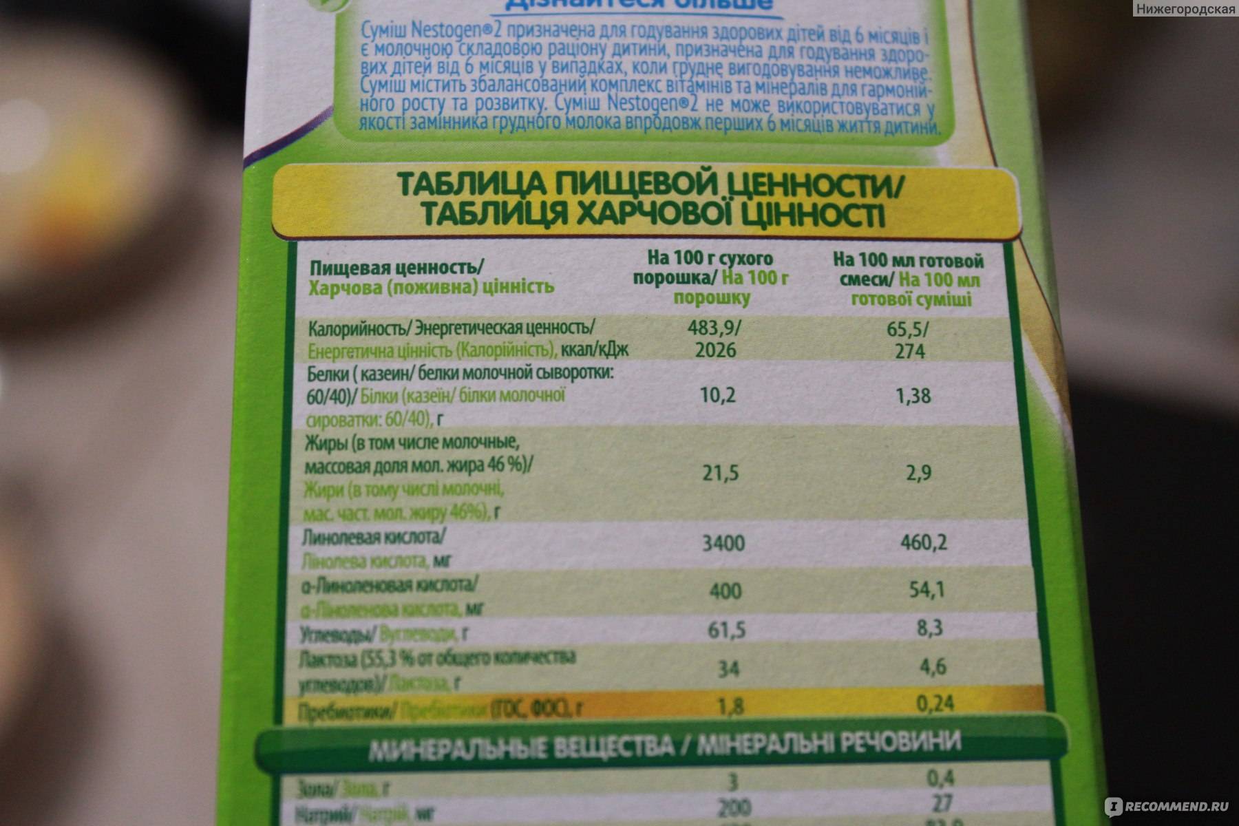 В состав сухой смеси Нестожен 2, помимо перечисленных выше ингредиентов, входят углеводы (17 г на литр полученной смеси), а содержание лактозы, сывороточных белков, витаминов и минеральных веществ увеличено таким образом, чтобы удовлетворялись потребности растущего организма ребенка. Именно по причине изменения состава смеси Нестожен 2 – более сытное питание, больше подходящее для кормления детей, чей возраст превышает 6 месяцев.