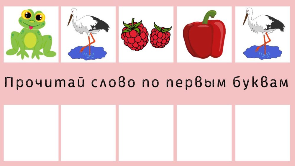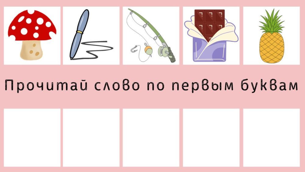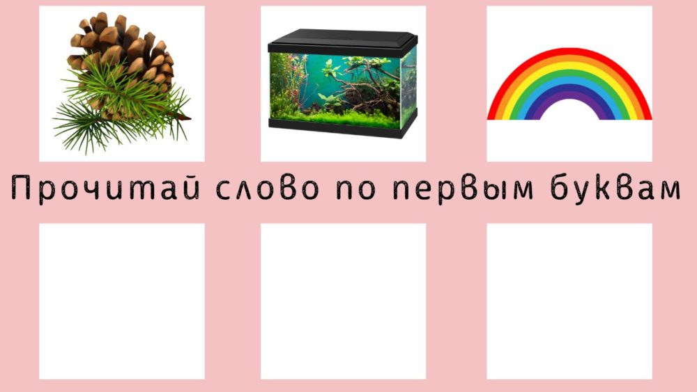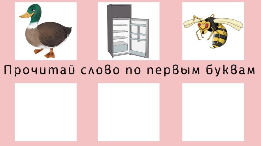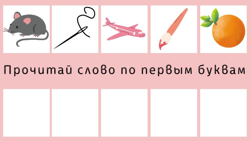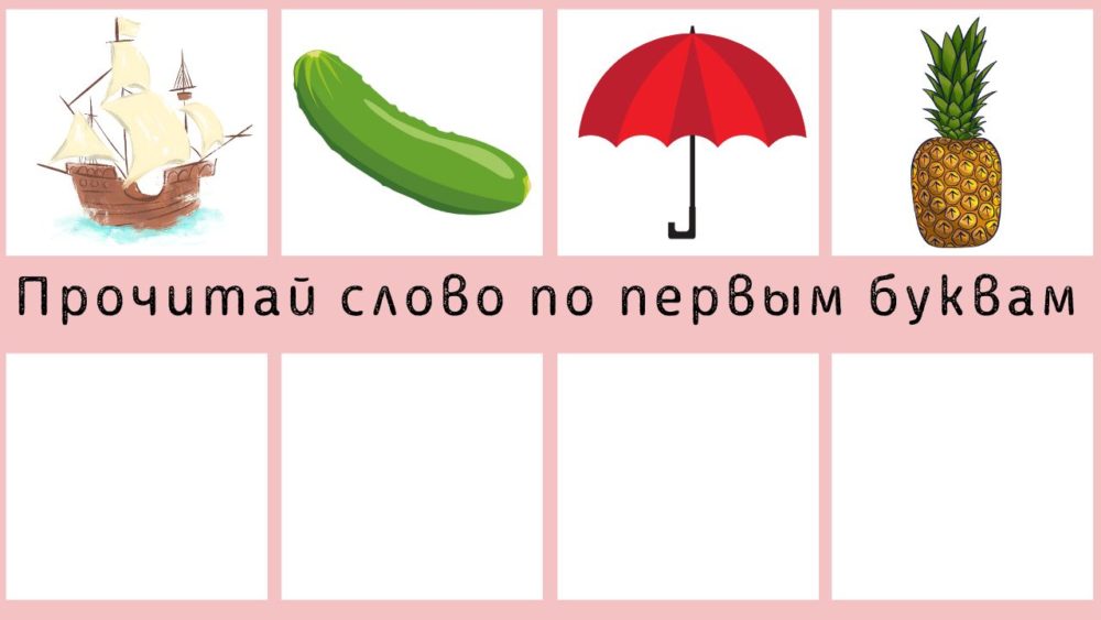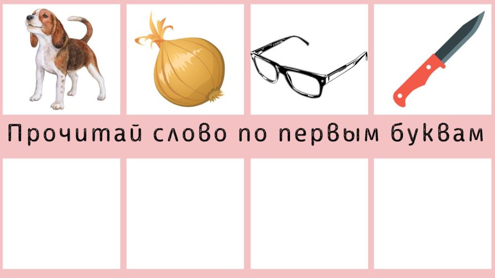 На первом этапе игры «Прочитай по первым буквам» для дошкольников ребенок должен внимательно посмотреть на объекты, изображенные на карточке. Выделить первый звук, из которого состоит название объекта. Затем отыскать на игровой панели аналогичные выделенным фонемам буквы, поставить рядом с ними фишки с номером, соответствующим порядку звука в слове. Прочитать получившееся слово.