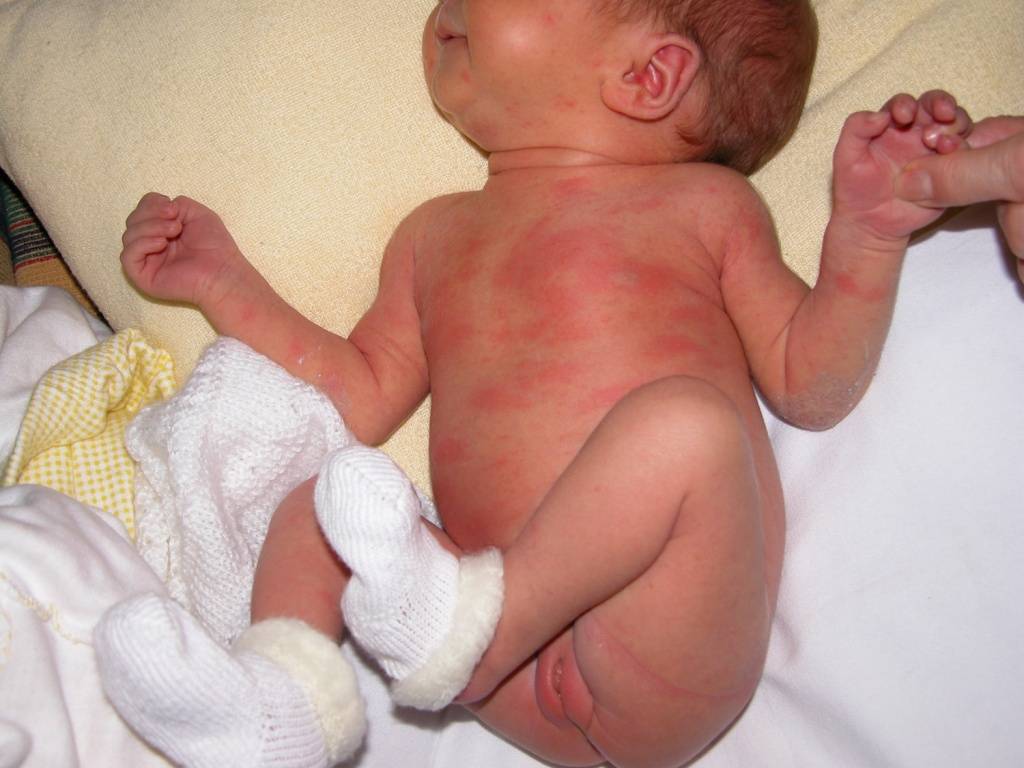 Клиническая картина токсической эритемы появляется уже на вторые или третьи сутки после появления малыша на свет. На его кожных покровах образуются аллергические высыпания, и преимущественно местом из локализации становится лицо. Такие высыпания напоминают плотные пятна серо — красного цвета, в которых имеются пузырьки. Такие пятна могут поражать и такие части тела ребенка, как голова, груди, ягодицы и суставы.