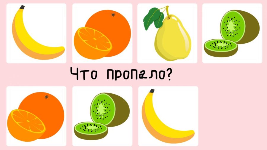 Воспитатель раскладывает карточки. Воспитанники внимательно рассматривают изображения, стараются их запомнить. Можно для лучшего запоминания в процессе раскладывания рассказать о каждом фрукте стишок. Затем дети крепко зажмуриваются, отворачиваются, чтобы не подглядеть, а педагог убирает одну карточку. Открыв глаза, дети должны сказать, какой плод исчез.