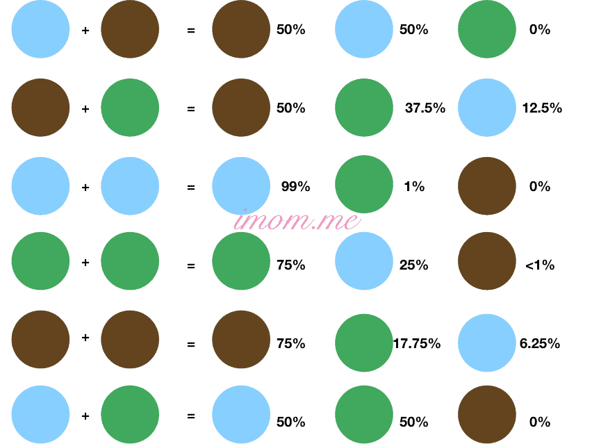 Существует и другая схема, которая показывает, с какой вероятностью ребенок родится с тем или иным цветом глаз по цвету глаз родителей. Также в некоторых случаях определенный цвет глаз не может быть вообще.