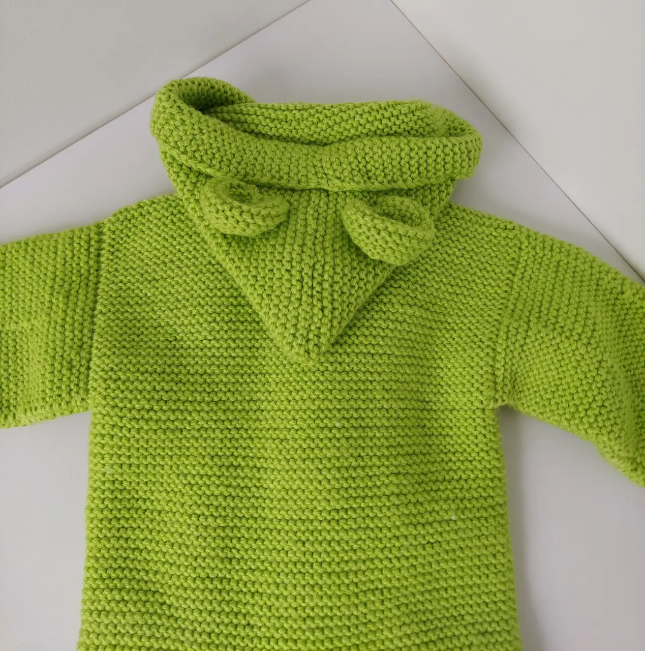 - Закончите капюшон комбинезона, провязав узор «платочной вязки» в течение 10 см и связав 2 ряда резинки 1 на 1.