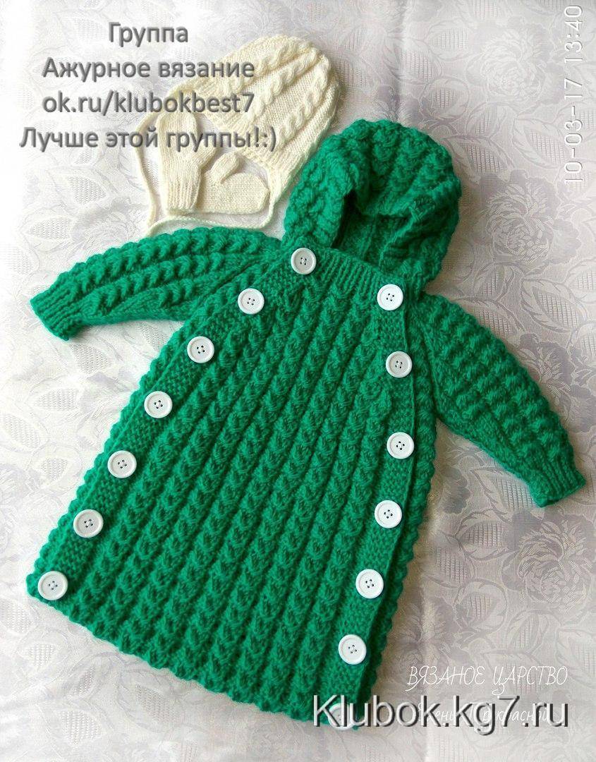Размер — от 0 до 3-х месяцев.Вам понадобится 450 гр пряжи с толщиной нити 150 м. на 100 гр. . спицы №3 или №4 Описание: Набрать на спицы 61 петлю или 36 см и вязать узором ОБЪЕМНАЯ РЕЗИНКА 8 рядов или 3-4 см.. Затем перейти на узор ГУСИНЫЕ лапки и вязать 6 узоров или 11 см.Закрыть заднюю часть капюшона по серединным 3 узорам.Набрать петли по нижней части капюшона и вязать резиночку 1х1 3-4 см. Расчитать линию реглана как показано на видео и вязать делая прибавки по регланным линиям в каждом лицевом ряду по две петли по реглану. Вязать до линии проймы 12 см или 7 узоров. Рукава: начинаем вязать на лицевой стороне — связать первые 10 петель до первой регланной линии и снять их на дополнительную спицу. Дальше вязать только рукав убавляя по 1 петле с каждой стороны через 4-6 рядов. Вяжем на нужную длину — у меня это 9 узоров от проймы или 15-16 см. Закончить рукав резиночкой. Аналогично вяжем второй рукав. Нижняя часть конверта: собираем все петли на одну спицу и вяжем низ конверта на длину равную росту ребенка. У вас это может быть другой размер. Но у меня 52 см. или 24 узора. Затем переходим к вязанию передней части — закрыть с обеих сторон сразу по 7 петель и дальше вяжем до проймы. По краям оставить по 5 петель планки. На планках надо будет делать петли для пуговиц с обеих сторон через 16 рядов. Как только дошли до проймы начинаем вязать убавляя петли в каждом лицевом ряду по 1 петле с двух сторон и вяжем до линии резиночки по горловине.Закончить вязание резиночкой.