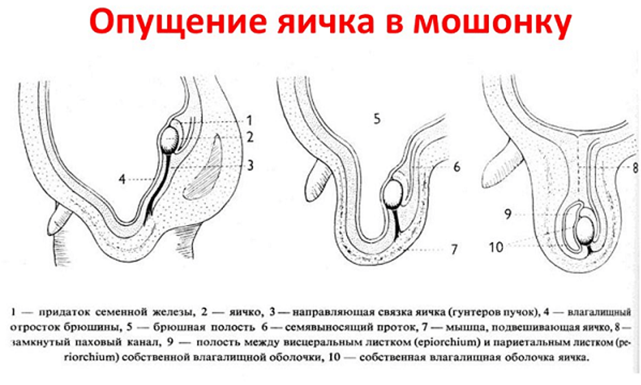 У здорового доношенного мальчика яички опускаются в мошонку сразу после рождения, если этого не происходит, то речь идет о патологии и довольно распространенном заболевании среди младенцев мужского пола – крипторхизме (неопущении яичек в мошонку). Если спустя первый год жизни яички не опустились в мошонку, их возвращают на место хирургическим путем.