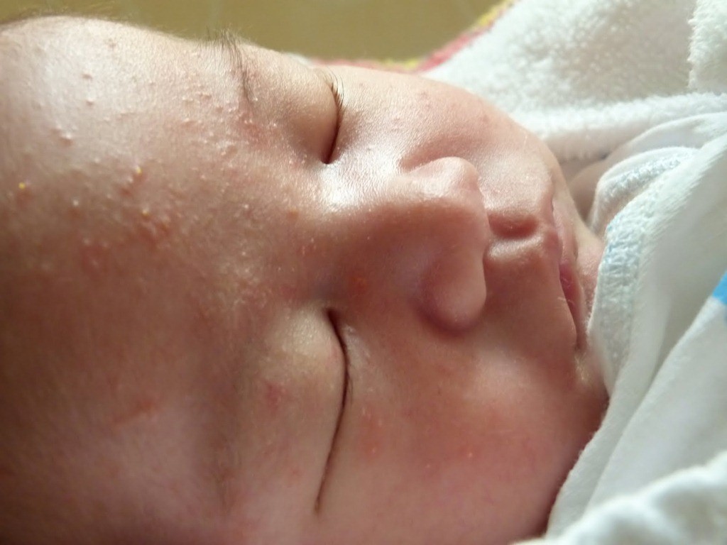 Речь идет о так называемом «акне новорожденного», которое выступает на коже в первый месяц жизни вашего крохи. Ее появление объясняется следующим: гормональный фон малыша начинает приходить в норму, покидают организм ребенка мамины гормоны, которые были получены во время беременности. В процессе этого перестроения на теле появляются небольшая красноватая сыпь – чаще всего на лице, иногда сыпь локализуется на верхней части туловища.