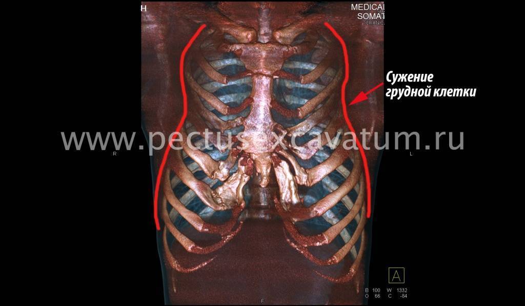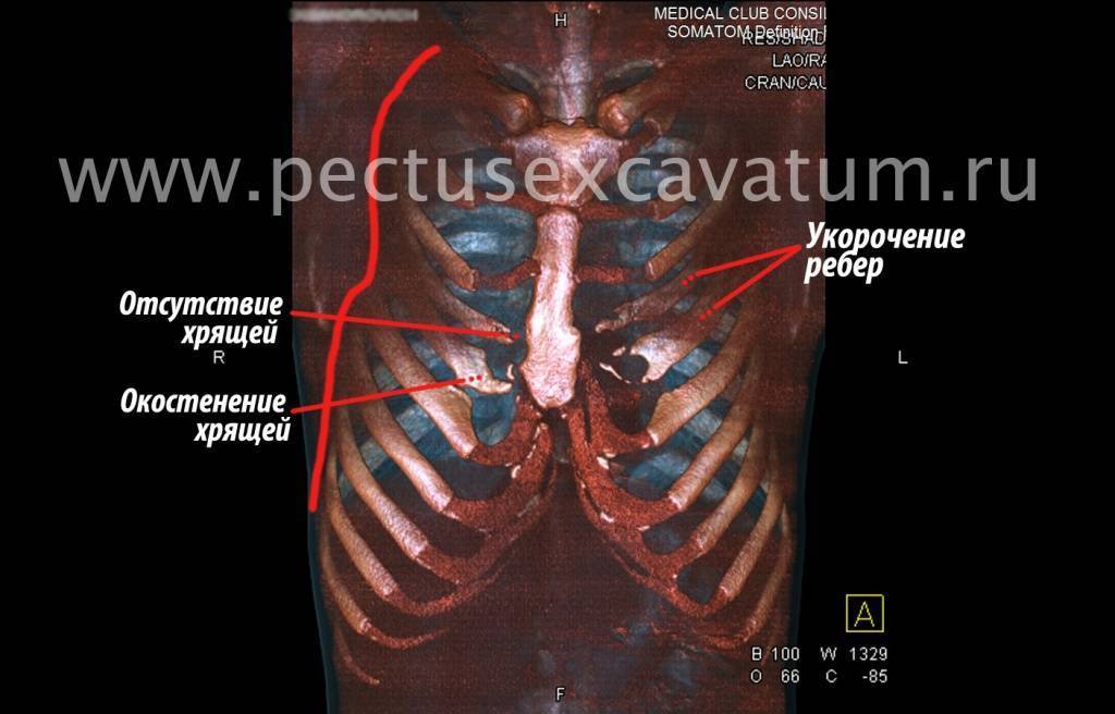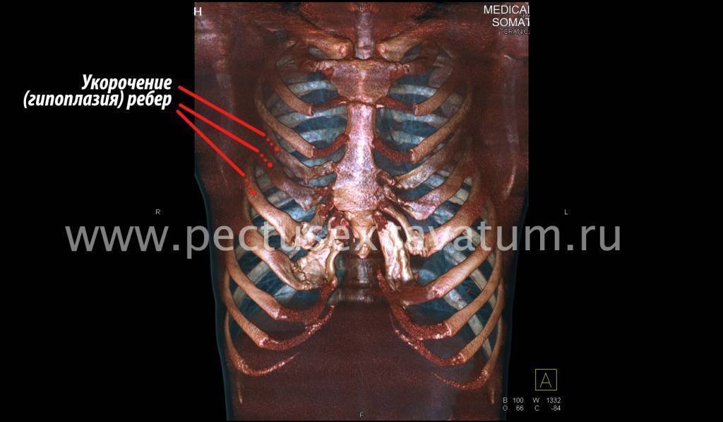 Картина РКТ показала, что 4-ое, 5-ое, и частично 6-ое ребра недоразвиты, они суживают грудную клетку, как бы охватывая ее жестким обручем, препятствуя естественному дыханию. Более того, на месте полноценных хрящей развилась костная ткань, которая придала грудной клетке панцироподобные свойства.