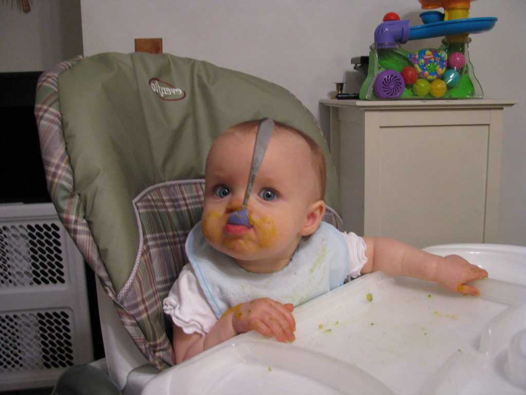 Не нужно ругать малыша за испачканную одежду, ведь он еще плохо контролирует свои движения.