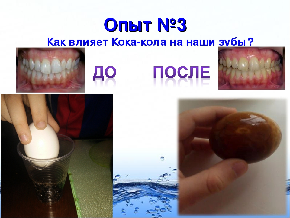 Воспитатель: правильно, оно потемнело потому что в кока-коле содержится краситель, вот что может случится с нашими зубками если употреблять кока-колу.